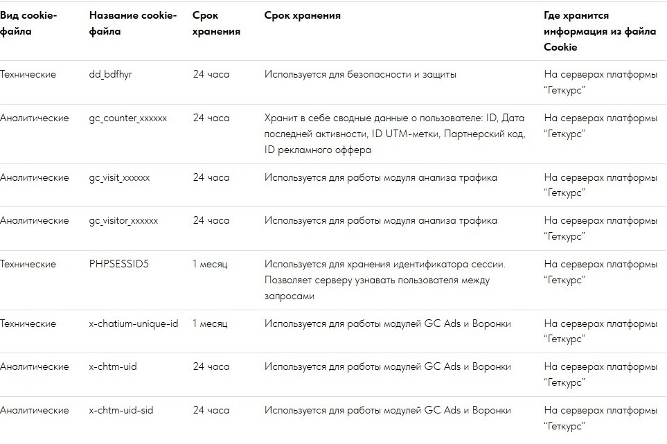 | Аналитические | gc_counter_xxxxxx | 24 часа | Хранит в себе сводные данные о пользователе: ID, Дата последней активности, ID UTM-метки, Партнерский код, ID рекламного оффера | На серверах платформы “Геткурс” |